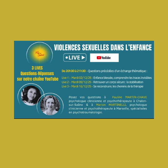 Les violences sexuelles vécues dans l’enfance ou l’adolescence laissent des traces profondes, souvent invisibles. Ce cycle de trois lives à visée de prévention et de sensibilisation a pour objectif d’apporter compréhension, stabilisation et outils concrets pour...